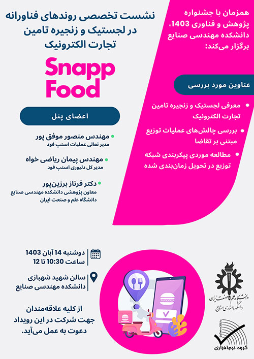 همزمان با جشنواره پژوهش و فناوری ۱۴۰۳، دانشکده مهندسی صنایع با حضور مدیران شرکت اسنپ فود نشست تخصصی تحت عنوان «روندهای فناورانه در لجستیک و زنجیره تأمین تجارت الکترونیک» را برگزار مینماید.